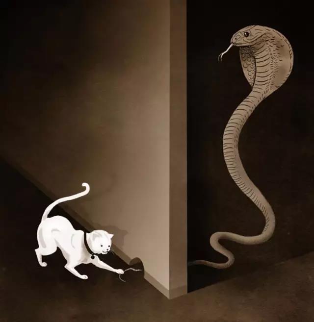 畫(huà)中的(de)貓把蛇尾當成鼠尾,毫不(bù)畏懼地(dì)用(yòng)爪子™±(zǐ)抓著(zhe)蛇的(de)尾巴。