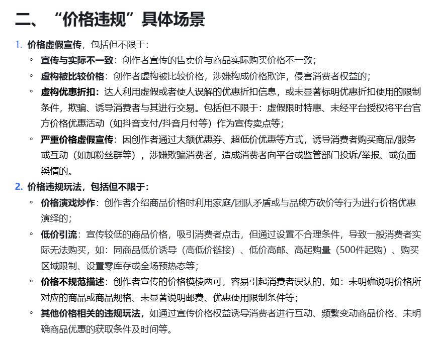 這(zhè)裡(lǐ)提及的(de)價格$₩'違規行(xíng)為(wèi),指的(de)是(shìε£)抖音(yīn)電(diàn)商達人(r ₽•én)在商品推廣過程中出現(xiàn)的(de)價格虛假™× 宣傳、價格違規玩(wán)法行(xíng)為(wèi),或未履 行(xíng)所承諾的(de)價格服務等行(xíng)為(wèi)δ₹,具體(tǐ)表現(xiàn)為(wèi)宣傳價格與實際不(bù)符≥↑、虛構被比較價格、虛構優惠折扣等、嚴重價格虛假宣傳等。
